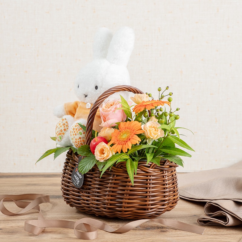秋をたっぷり感じさせる温かみと元気さのあるお色味のお花たちに囲まれてミッフィーもうれしそう。