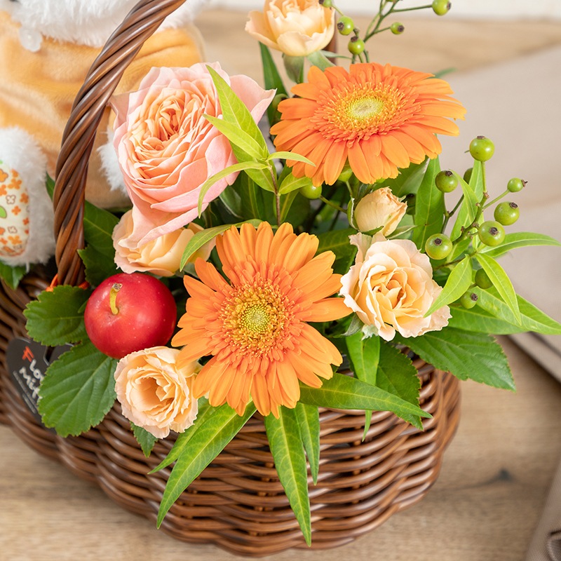 『着せかえほわほわぬいぐるみ キンモクセイミッフィー』を使用した秋の季節おすすめのフラワーアレンジです☆