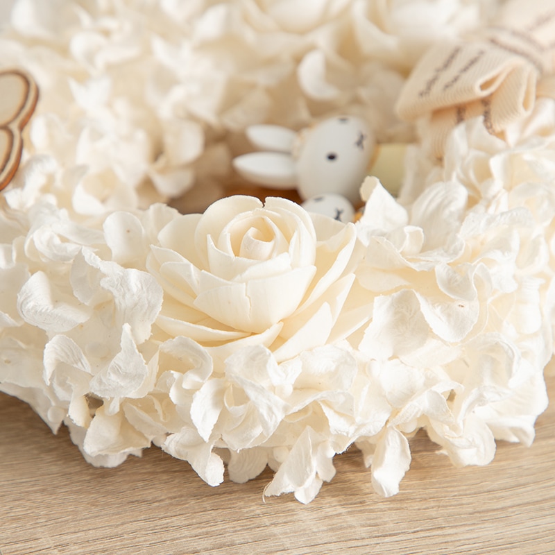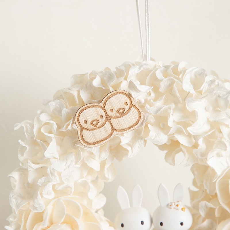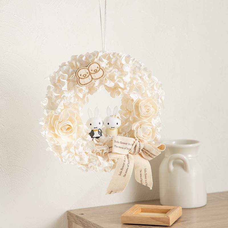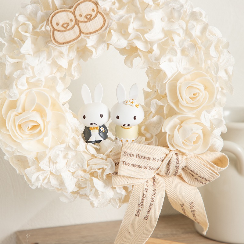 ホワイトを基調としたフラワーリースに合わせ、ミッフィーもやさしさあふれる木製でナチュラルな仕上がりに。