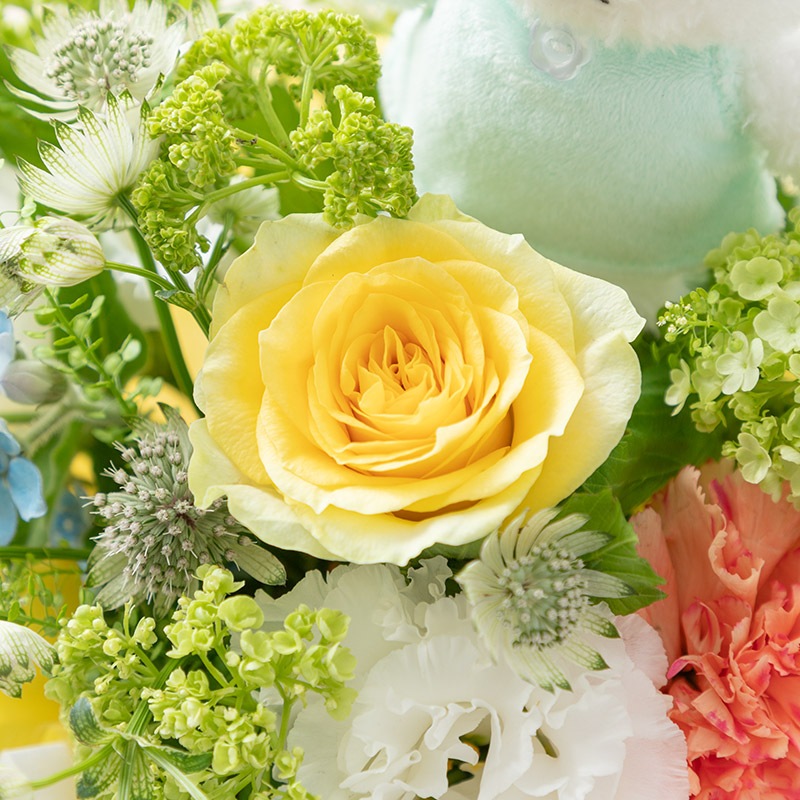 黄色のバラや色鮮やかなカーネーションなどがアクセントとしてまとめられた素敵なフラワーアレンジです。