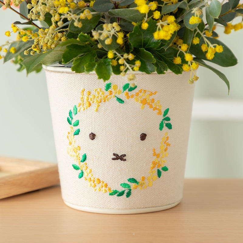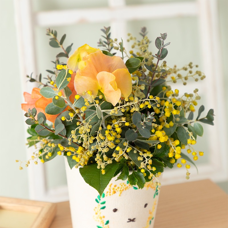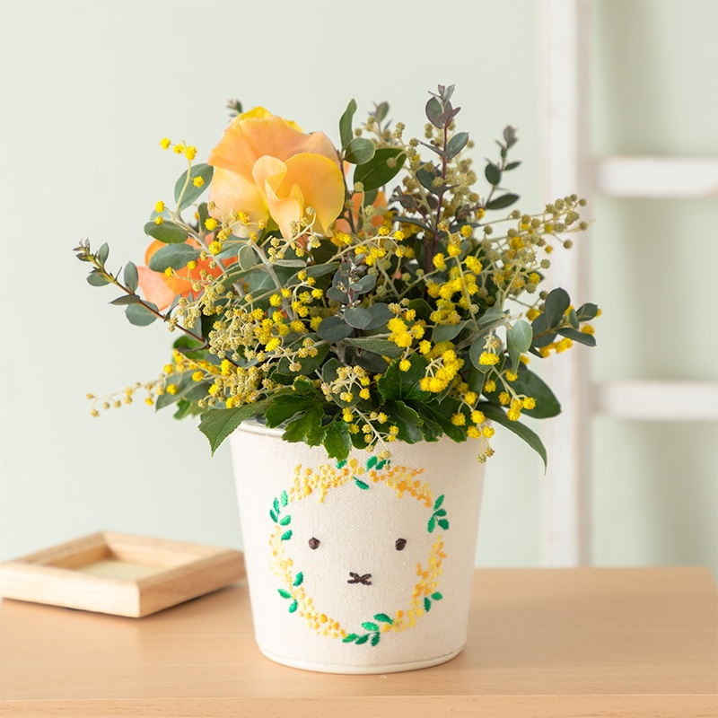 ミッフィーのブリキ缶を使用したかわいらしいく華やかなミモザのフラワーアレンジ☆