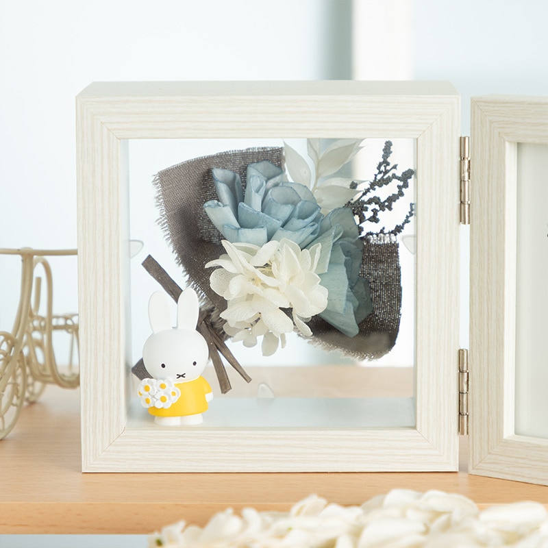 ボックスを開くと見えるのは、キュートなミッフィーと爽やかなブルーのソラフラワーを使用した上品なアレンジメント。