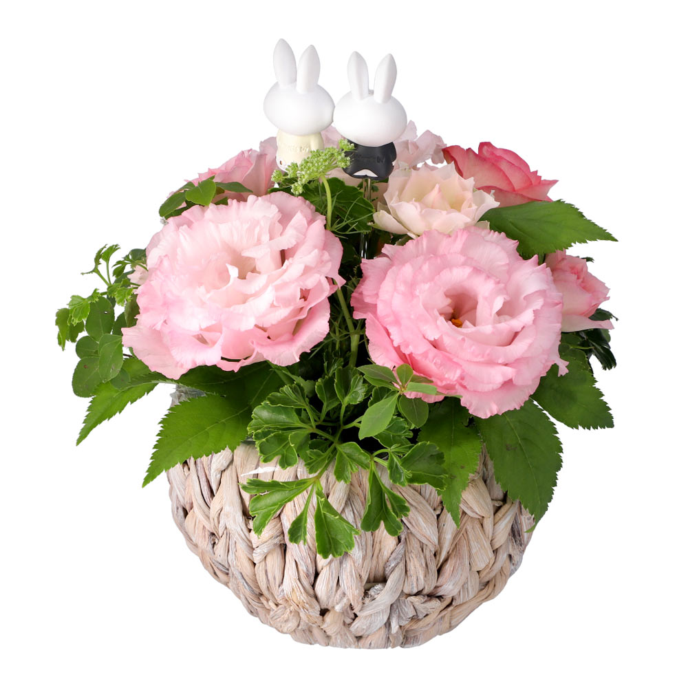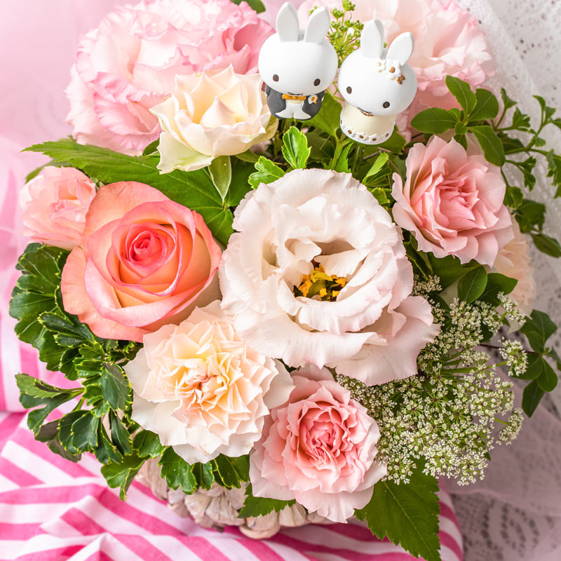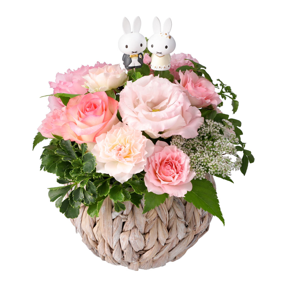 人気のミッフィー新郎新婦ピックを使用した、素敵なフラワーアレンジです。