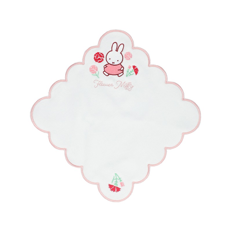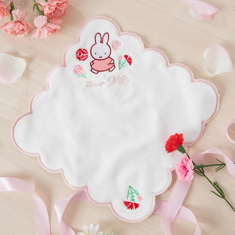 スカラップデザインがかわいいハンカチにはカーネーションの刺繍をあしらいました。
