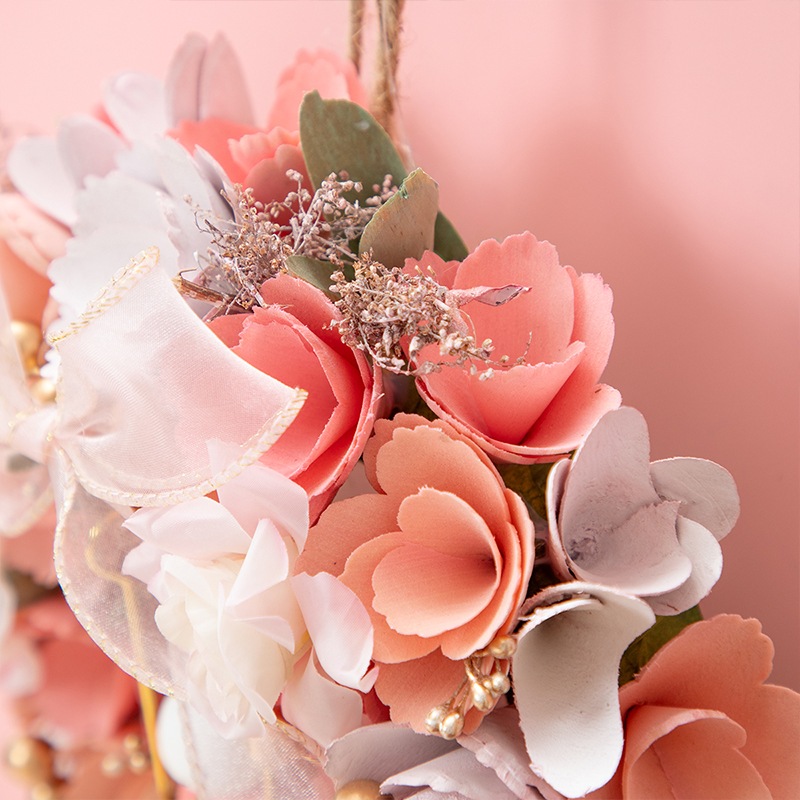 やさしいピンクのリースに大きな白いリボンが目を引く素敵なリース。